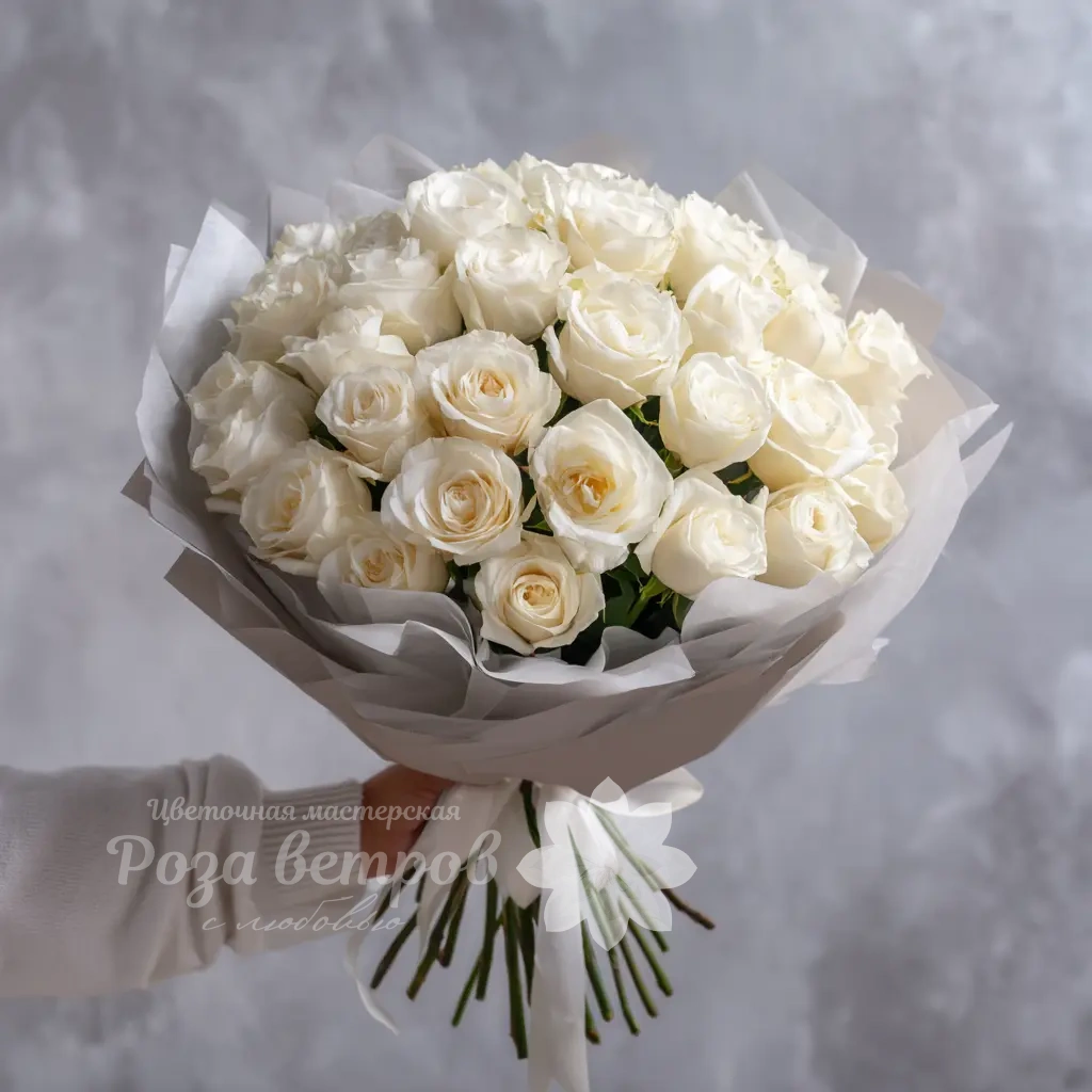 Белые розы в приглушённой палитре и упаковке цвета тумана — для создания атмосферы загадочности и элегантности. Такой букет говорит о глубине и осознанности чувств.