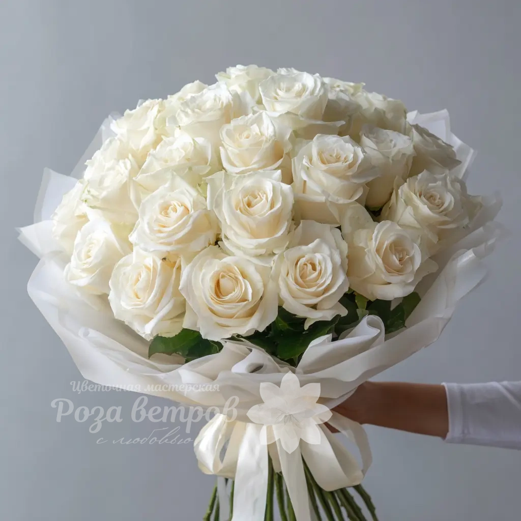 Нежный и лёгкий букет из белых роз, словно облака с каплей утреннего аромата. Прекрасен как подарок для романтических случаев или в качестве комплимента без повода. Сочетает свежесть и деликатность.