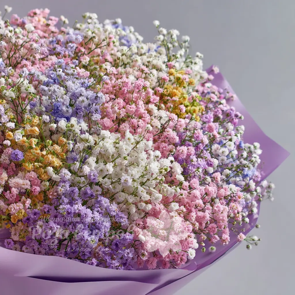 Богатая, объёмная структура создаёт ощущение цветочной волны. Гипсофила выглядит воздушно и динамично, а букет дарит настроение яркого торжества.