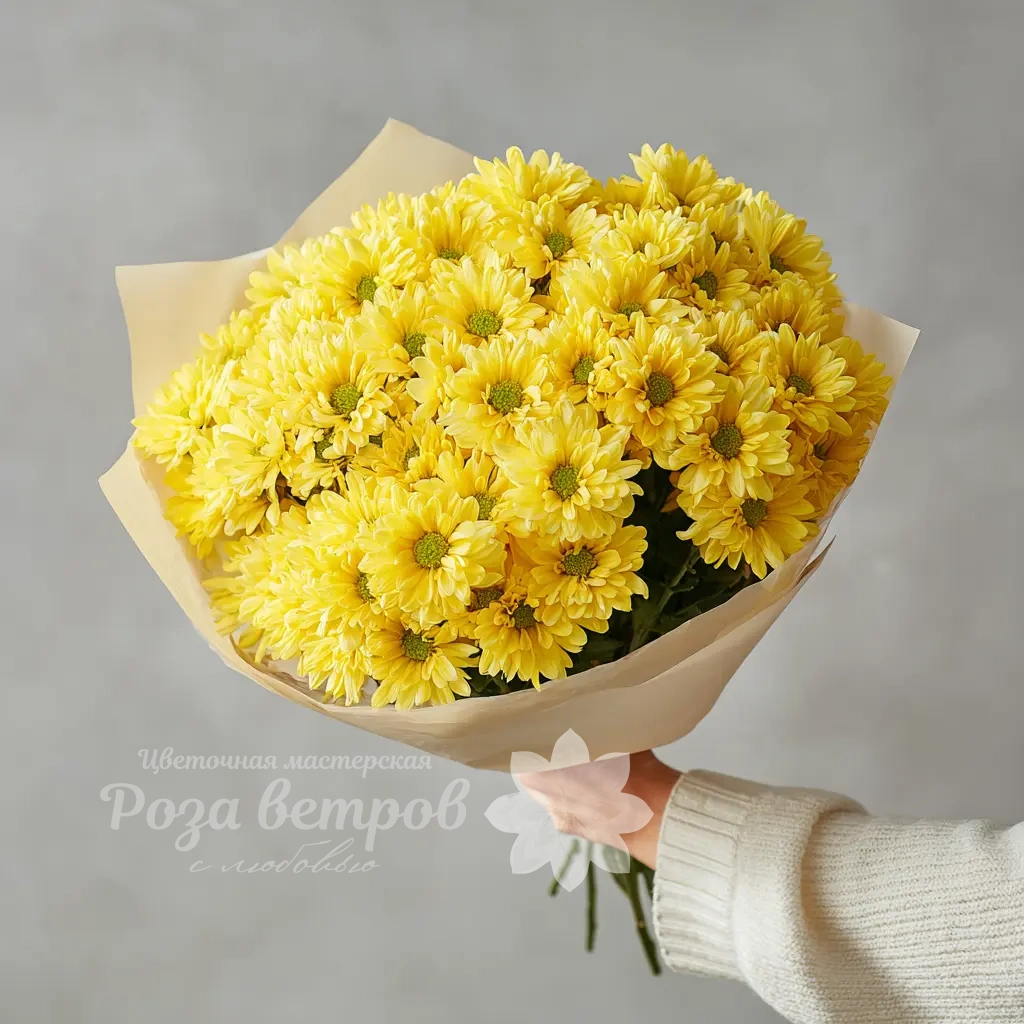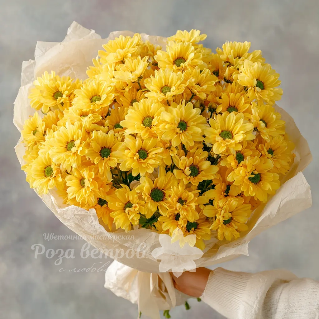 Яркий и солнечный букет, наполненный жизнерадостной энергией. Кустовые хризантемы образуют пышную и живую форму — отличное решение для доброго утреннего подарка или поздравления друга.
