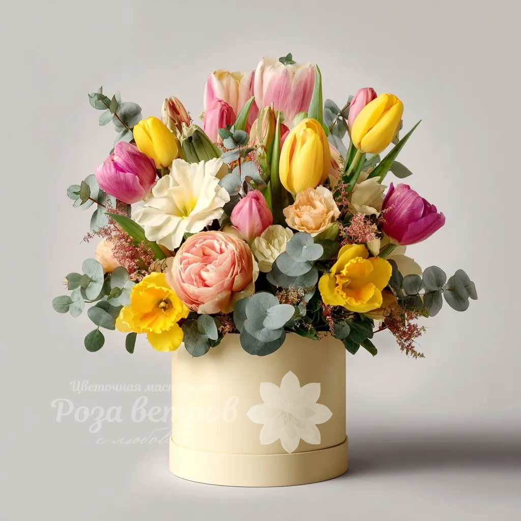 Яркая композиция с тюльпанами, нарциссами, которая наполняет пространство свежестью и радостью весны. Идеально для подарка или украшения.