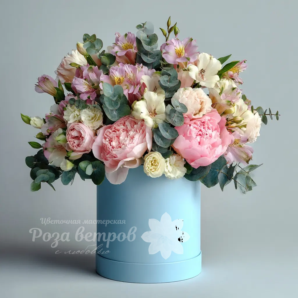Свежие пионы, альстромерия и эвкалипт создают ощущение летнего утра. Ароматная и легкая композиция для уютных моментов и особых случаев.