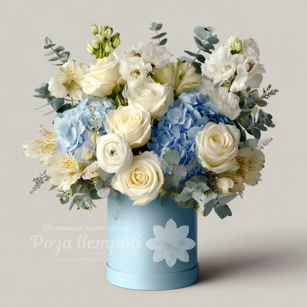 Белые розы, голубая гортензия и серебристый эвкалипт создают волшебную зимнюю атмосферу, наполняя дом теплом и уютом.