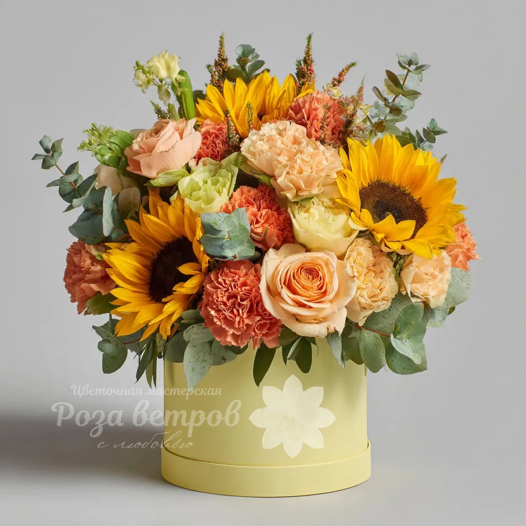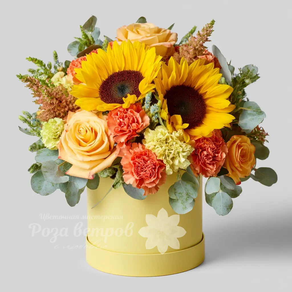 Подсолнухи, оранжевые гвоздики и кремовые розы — яркая палитра для теплых осенних дней.