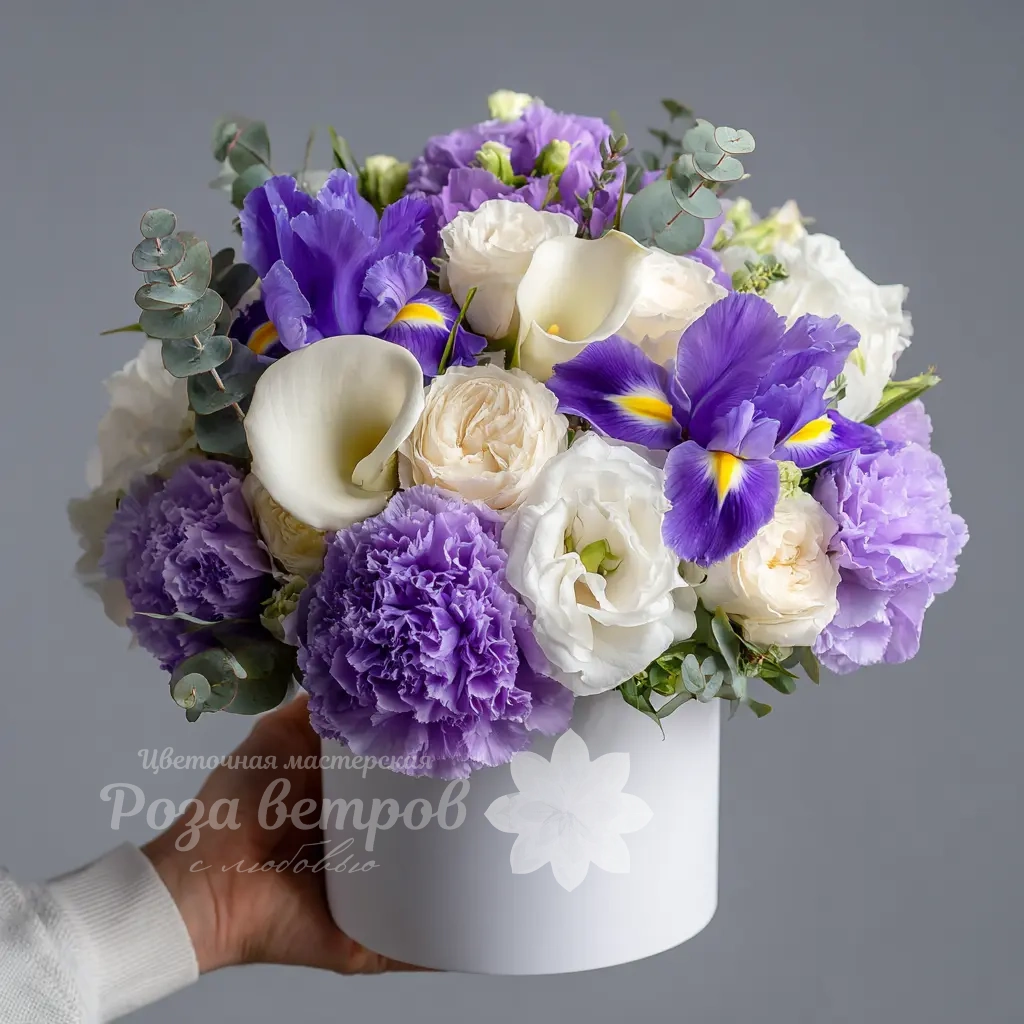Белые каллы, фиолетовые ирисы и гвоздики создают мягкую, романтичную атмосферу для особых вечеров.
