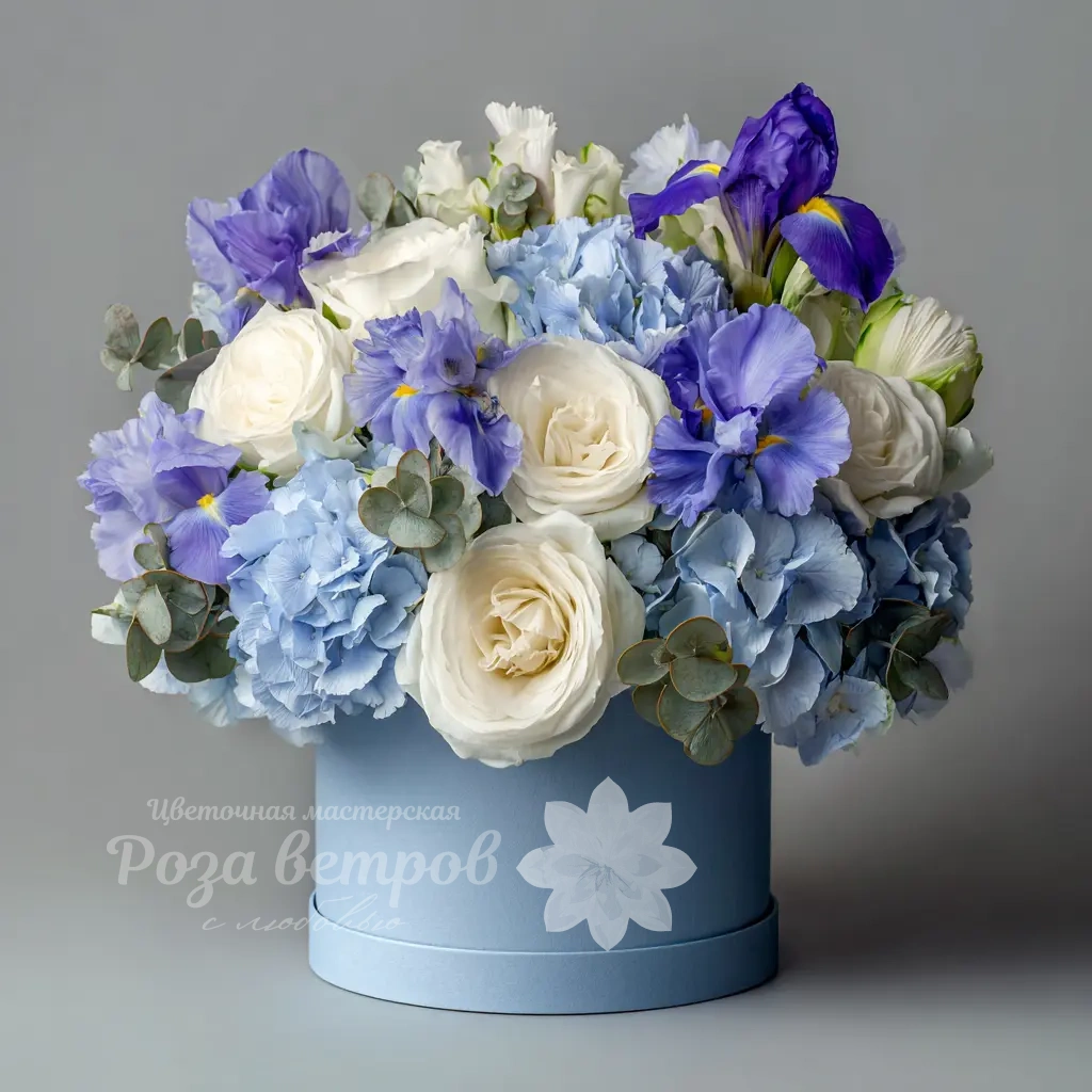 Фиолетовые ирисы, белые розы и зелень эвкалипта создают ощущение морского бриза и спокойствия.
