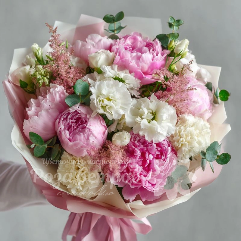 Пудрово-розовая палитра и мягкая текстура делают этот букет особенно трогательным. Пионы создают ощущение уюта, тепла и нежности. Прекрасный выбор для подарка девушке или подруге.