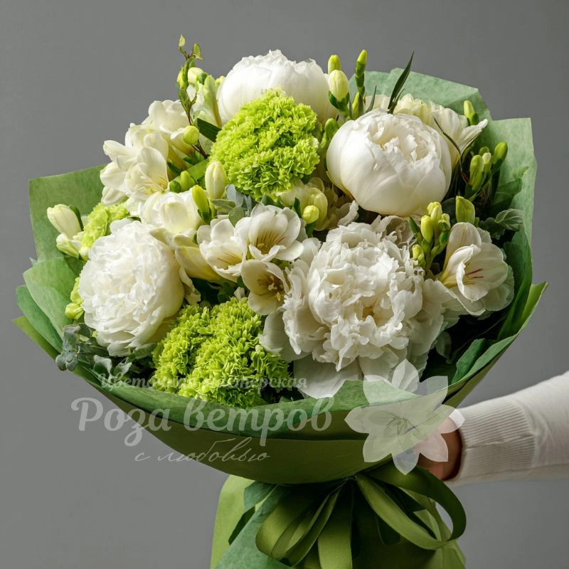 Композиция словно уголок природы с мягкими белыми бутонами и зелёными акцентами. Создаёт уют и ощущение спокойствия дома или в офисе.