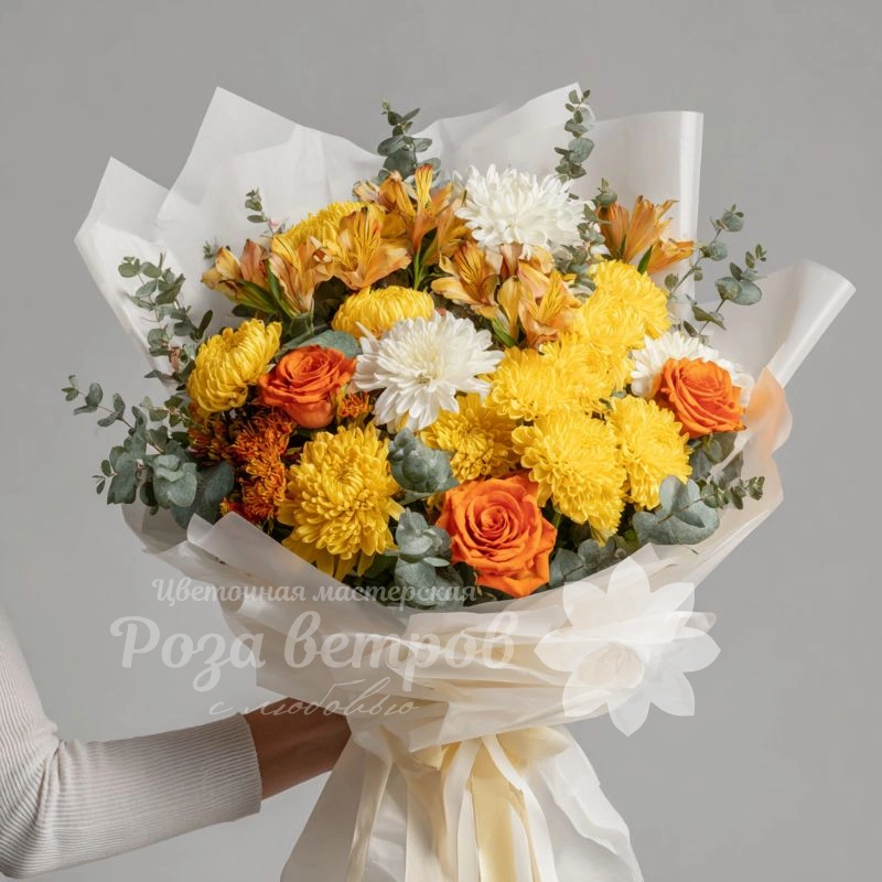 Тёплый и уютный букет, в котором собраны самые насыщенные оттенки осени — от желтого до золотистого. Хризантемы дарят атмосферу уюта и мягкого света, как октябрьский закат. Подходит для поздравлений и осеннего настроения.