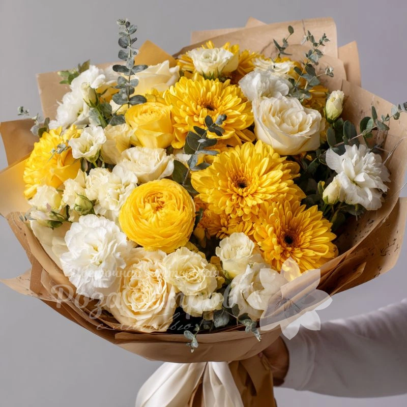Яркий букет из хризантем в жёлтой и белой гамме — словно лучик солнца в пасмурный день. Он поднимает настроение, наполняет пространство светом и идеально подойдёт для подарка без повода.
