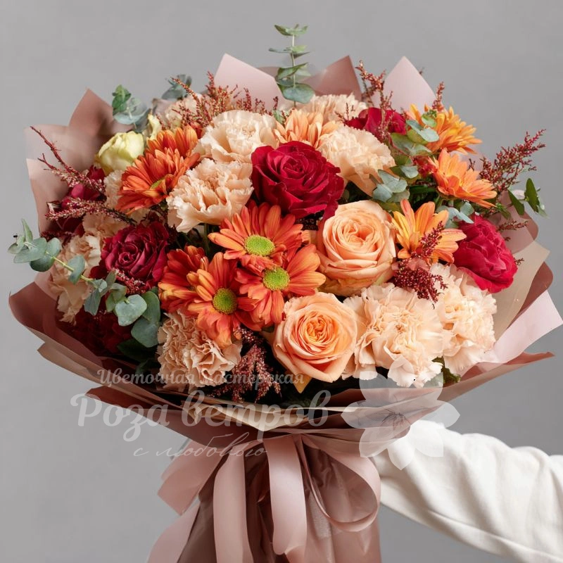 Как разноцветные листья, кружатся оттенки хризантем в этом букете. Каждый цвет — эмоция, каждое соцветие — послание. Букет идеально подойдёт для выразительных подарков в осенний период.