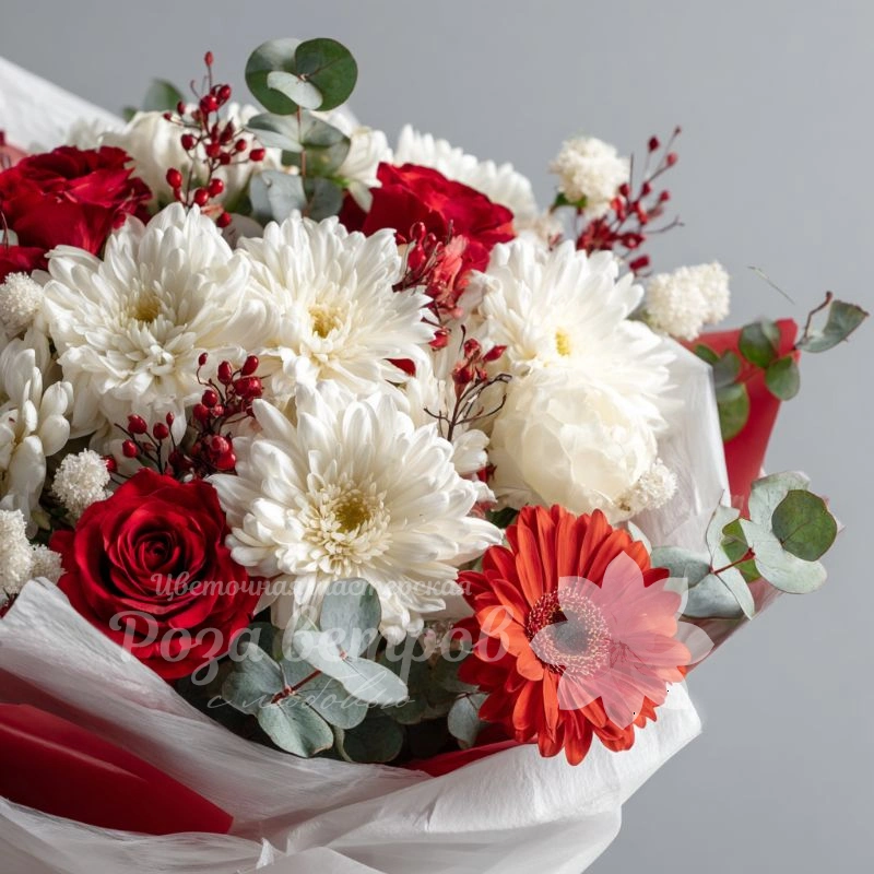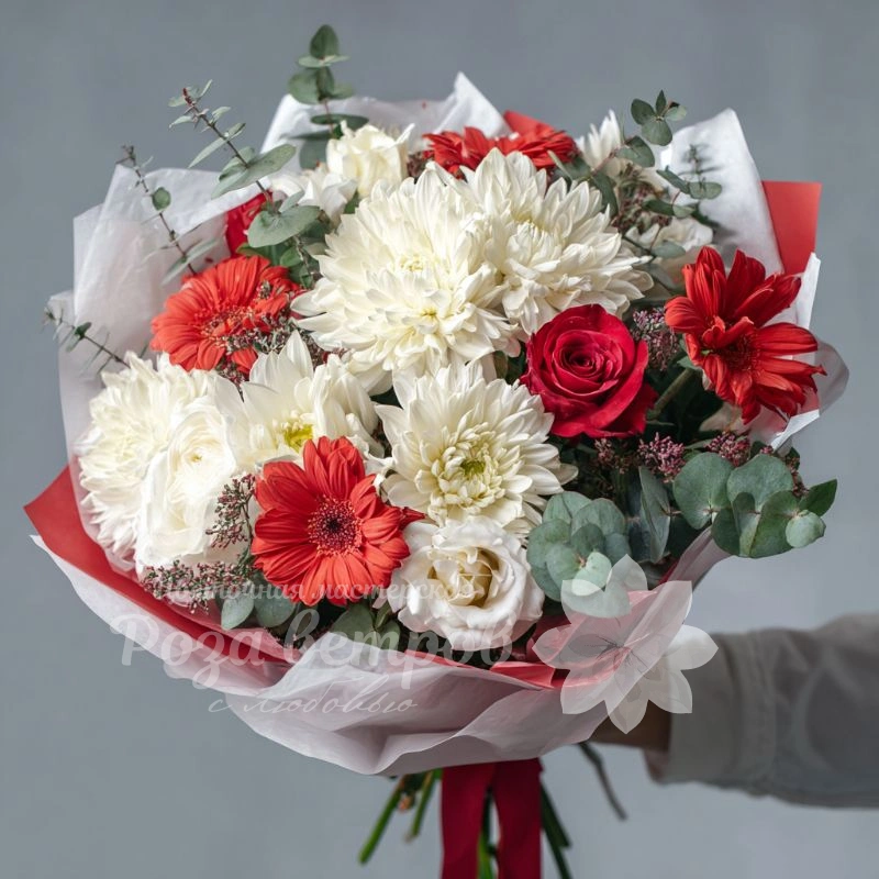 Собранный для торжеств и событий, этот букет наполнен яркими красками и хорошим настроением. Хризантемы долго сохраняют свежесть и эффектный вид, что делает их прекрасным выбором для праздника.
