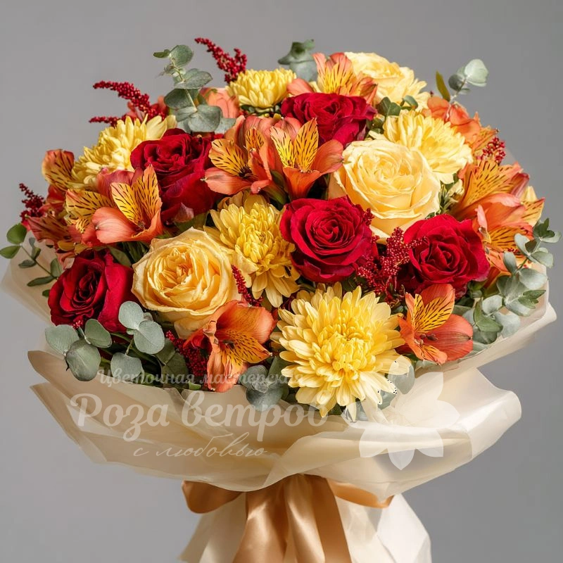 Глубокие, насыщенные оттенки этого букета напоминают о первых холодных вечерах и тёплых шарфах. Хризантемы в нём — как живые огоньки сентябрьского вечера. Стильно, сдержанно и по-осеннему уютно.