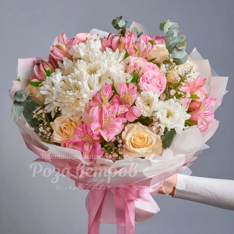 Сдержанная композиция в светлой гамме с белыми, кремовыми и розовыми оттенками. Хризантемы символизируют чистоту и уважение, а оформление делает букет универсальным для любого случая.