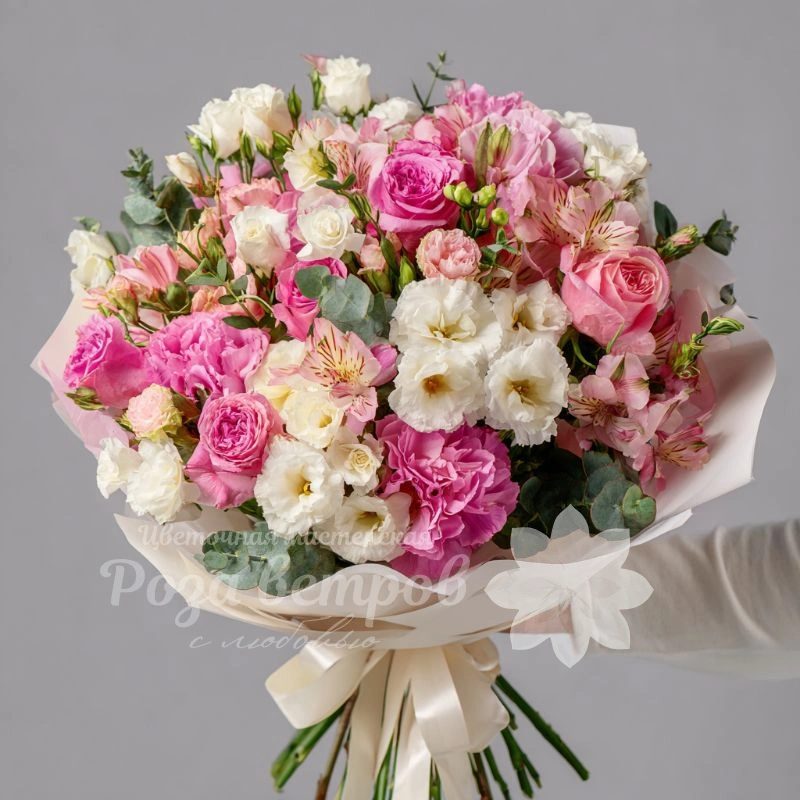 Светлая композиция, в которой раскрываются утренние оттенки розового и белого. Отличный подарок для женщин, ценящих утонченность.