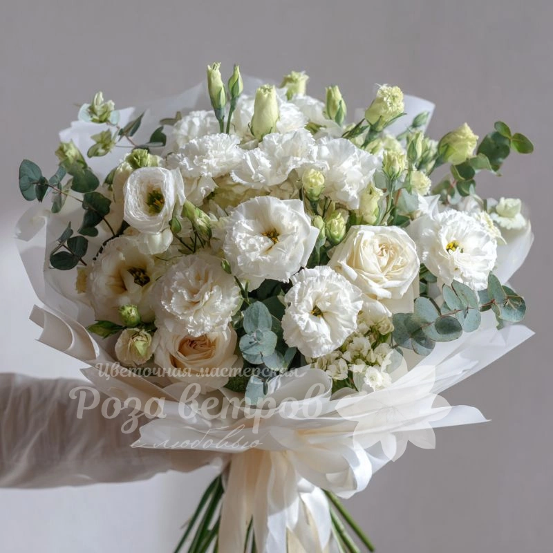 Полупрозрачная цветочная история, созданная из воздушных эустом. Букет в бежевых и молочных оттенках — выбор для свадеб, крестин или символа чистоты и лёгкости.