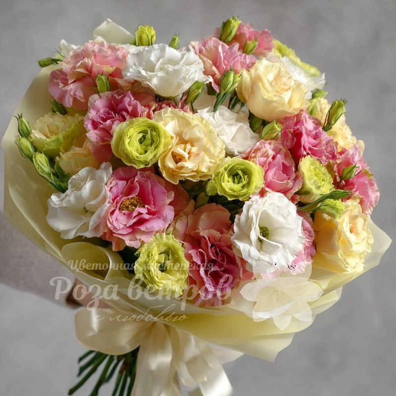 Цветочная музыка, в которой каждый лепесток звучит по-особенному. Богатая текстура, плавные переходы цвета — этот букет с эустомами подойдёт для особых моментов и любимых людей.