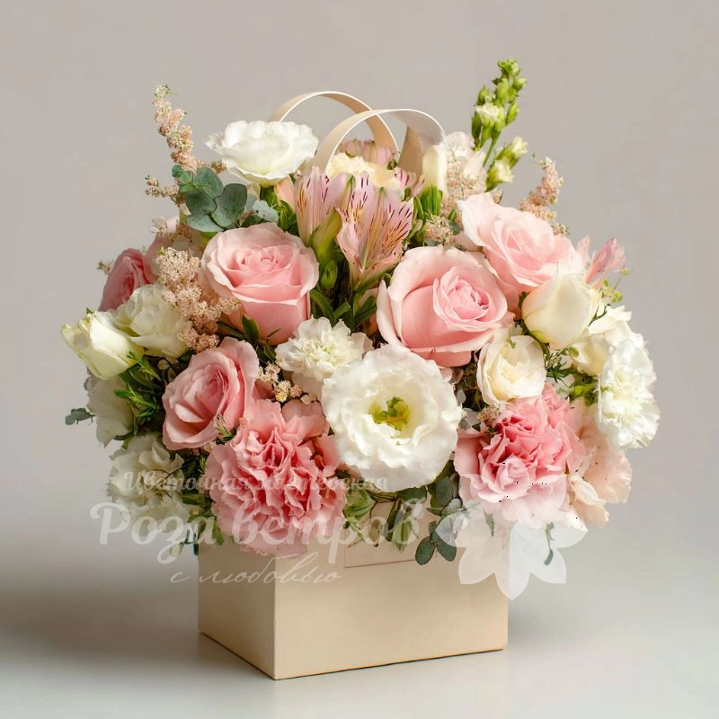 Цветочная нежность в компактной упаковке. Сочетание мягких оттенков и милого дизайна делает букет идеальным выбором для девушки любого возраста.