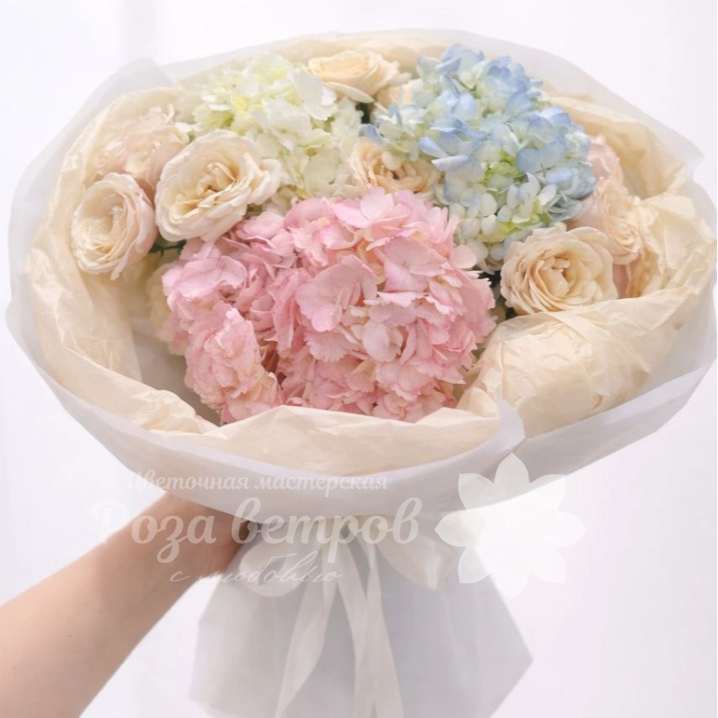 Букет "Нежное облако" - это воздушное сочетание гортензий и роз в пастельных тонах, создающее ощущение легкости и безмятежности. Нежные оттенки белых, розовых и голубых цветов гармонично дополняют друг друга, наполняя пространство нежностью и свежестью. Этот букет идеально подходит для выражения светлых чувств и эмоций.