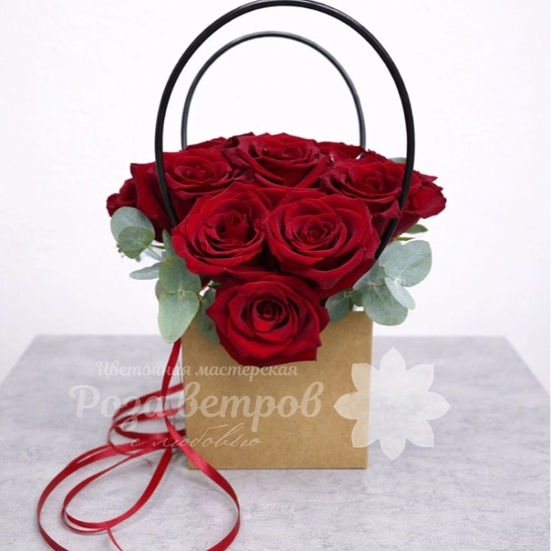 Букет из восьми ярких бордовых роз с добавлением эвкалипта в крафтовой коробке с черной металлической ручкой и атласной лентой. Розы насыщенного темно-красного оттенка создают выразительную композицию, подчеркивающую глубину и элегантность. Идеальный выбор для выражения страстной любви и глубоких чувств.