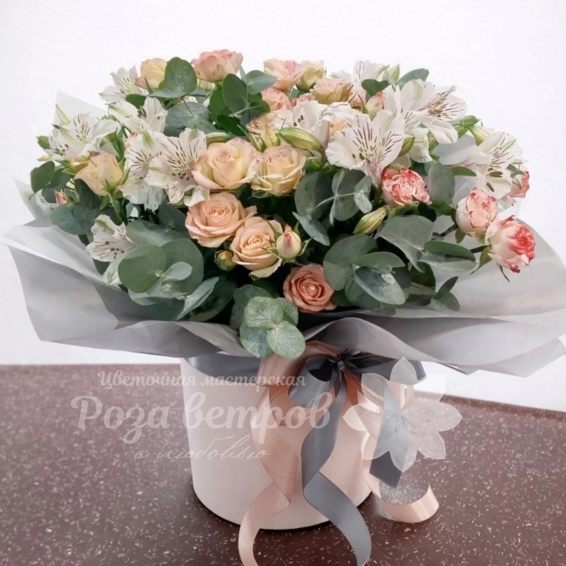 Нежный букет в пастельных тонах, состоящий из розовых и белых роз, альстромерий и эвкалипта, станет прекрасным подарком для самых дорогих людей. Букет оформлен в белую круглую коробку и украшен бантом из серой и персиковой ленты.