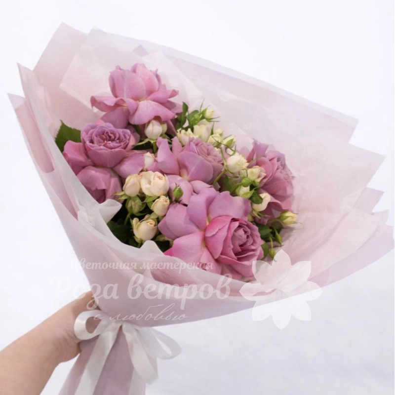 Букет розовых роз с добавлением белых бутонов и зелени, элегантно упакованный в легкую бумагу. Нежные оттенки цветов создают романтичную и трогательную композицию, идеальную для выражения любви и признательности. Этот букет станет прекрасным подарком на любой особый повод.