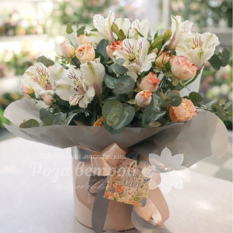 Букет, представленный в элегантной упаковке с декоративной лентой и поздравительной открыткой, выполнен в нежных тонах и станет прекрасным подарком на День рождения. Нежные белые альстромерии с тонкими красными штрихами и розовые розы создают воздушную композицию, дополненную зеленью эвкалипта.