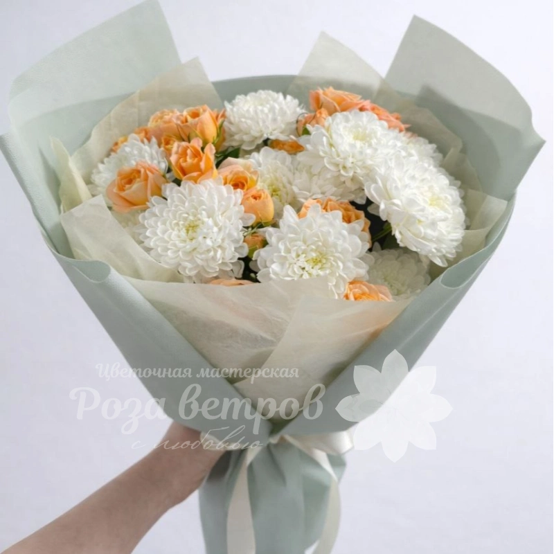 Нежный букет, состоящий из белых хризантем и персиковых роз, станет прекрасным подарком для самых дорогих людей. Сочетание воздушной текстуры хризантем и изящных роз создаст атмосферу уюта и тепла.