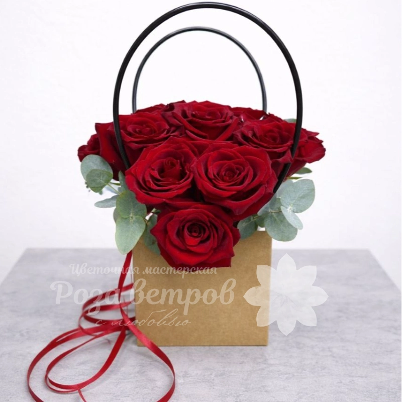 Описание букета Букет представляет собой элегантную композицию из 15 роскошных бордовых роз, дополненную свежими листьями эвкалипта и стилизованную под сумочку с атласной лентой. Букет помещен в картонную коробку с металлической ручкой, что придаёт ему современный и изысканный вид. Этот букет станет прекрасным выражением любви и внимания.