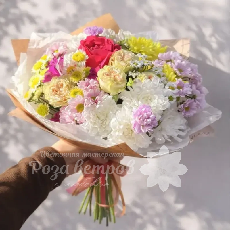 Букет представляет собой нежное и воздушное сочетание цветов в пастельных тонах с ярким акцентом. В его состав входят ромашки, гвоздики, ранункулюсы и гипсофила, объединённые в лёгкую и естественную композицию. Этот букет станет прекрасным подарком для тех, кто ценит нежную красоту и свежесть.