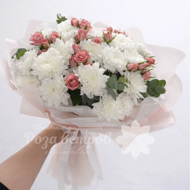 Нежный букет, состоящий из белых хризантем и кустовой розы, станет прекрасным подарком для самых дорогих людей. Лаконичная композиция в сочетании с элегантной упаковкой символизирует искреннюю заботу и любовь. Пышные цветы в нежных тонах привнесут тепло и красоту в любой интерьер.