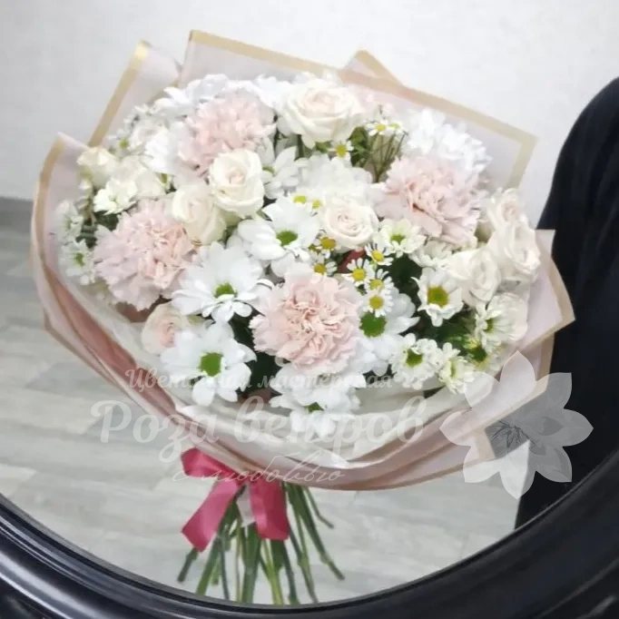 Букет, представленный на фотографии, являет собой нежное и элегантное сочетание белых и бледно-розовых цветов, среди которых можно выделить розы, гвоздики, ромашки и маргаритки. Композиция искусно оформлена в светло-бежевую упаковку с розовой лентой, что добавляет ей изящества и подчеркивает воздушность букета. Этот букет станет прекрасным выражением чувств и идеальным подарком для любого торжества.