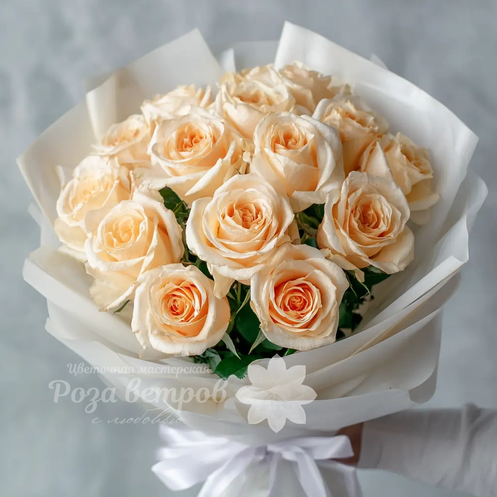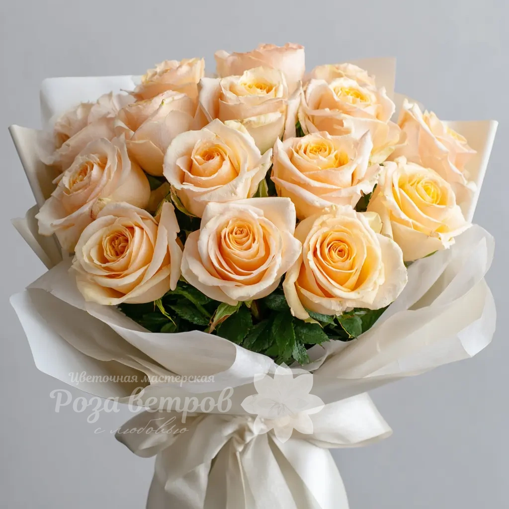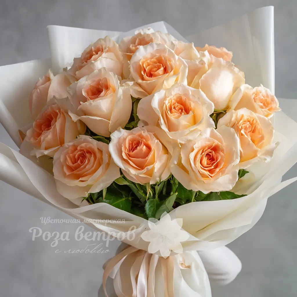 Мягкий, пастельный букет из 15 персиковых эквадорских роз подойдёт для изысканного подарка на день рождения, юбилей или свадебную годовщину. Персиковый цвет — символ благодарности и тёплого отношения.