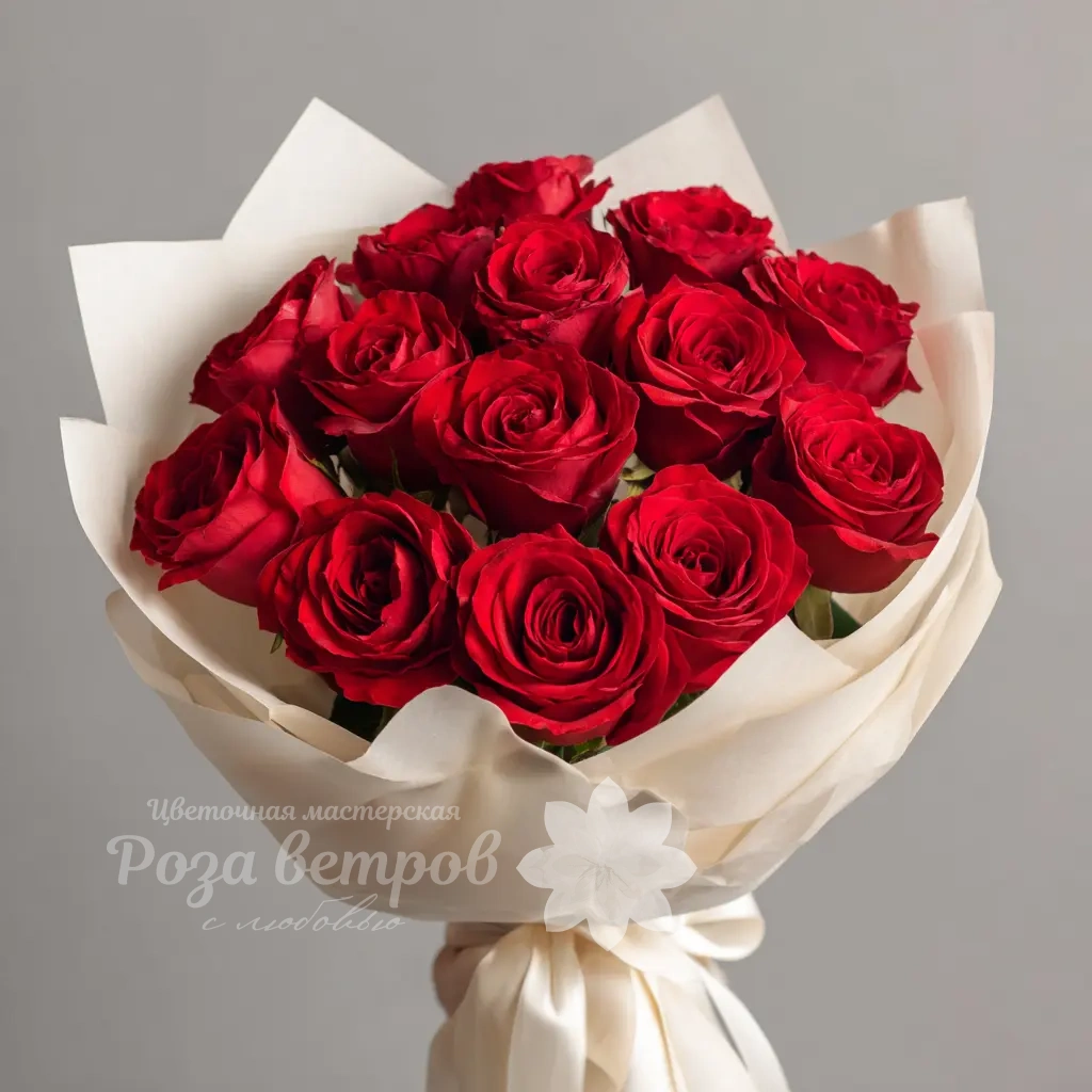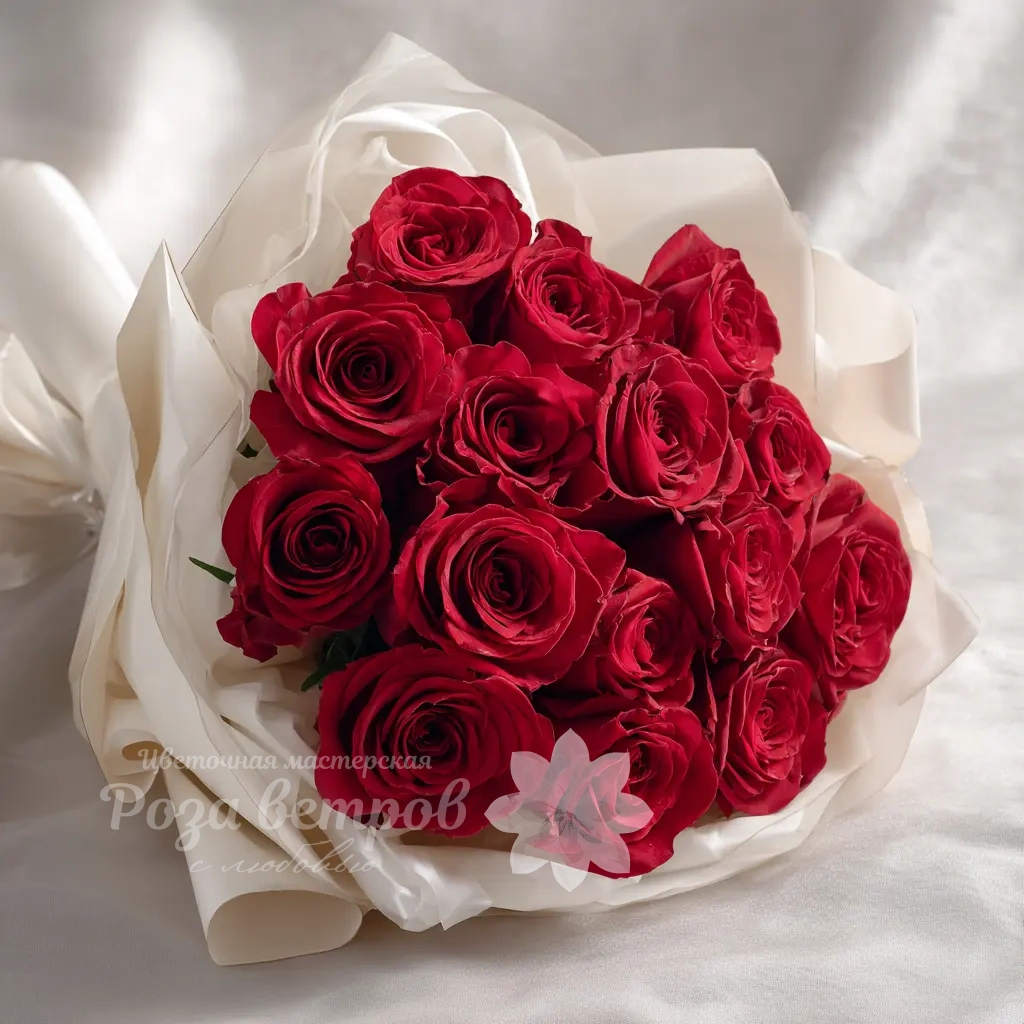 Роскошный букет из 15 алых роз с длинными стеблями — классика жанра. Подойдёт для свидания, предложения руки и сердца или выразительного комплимента.