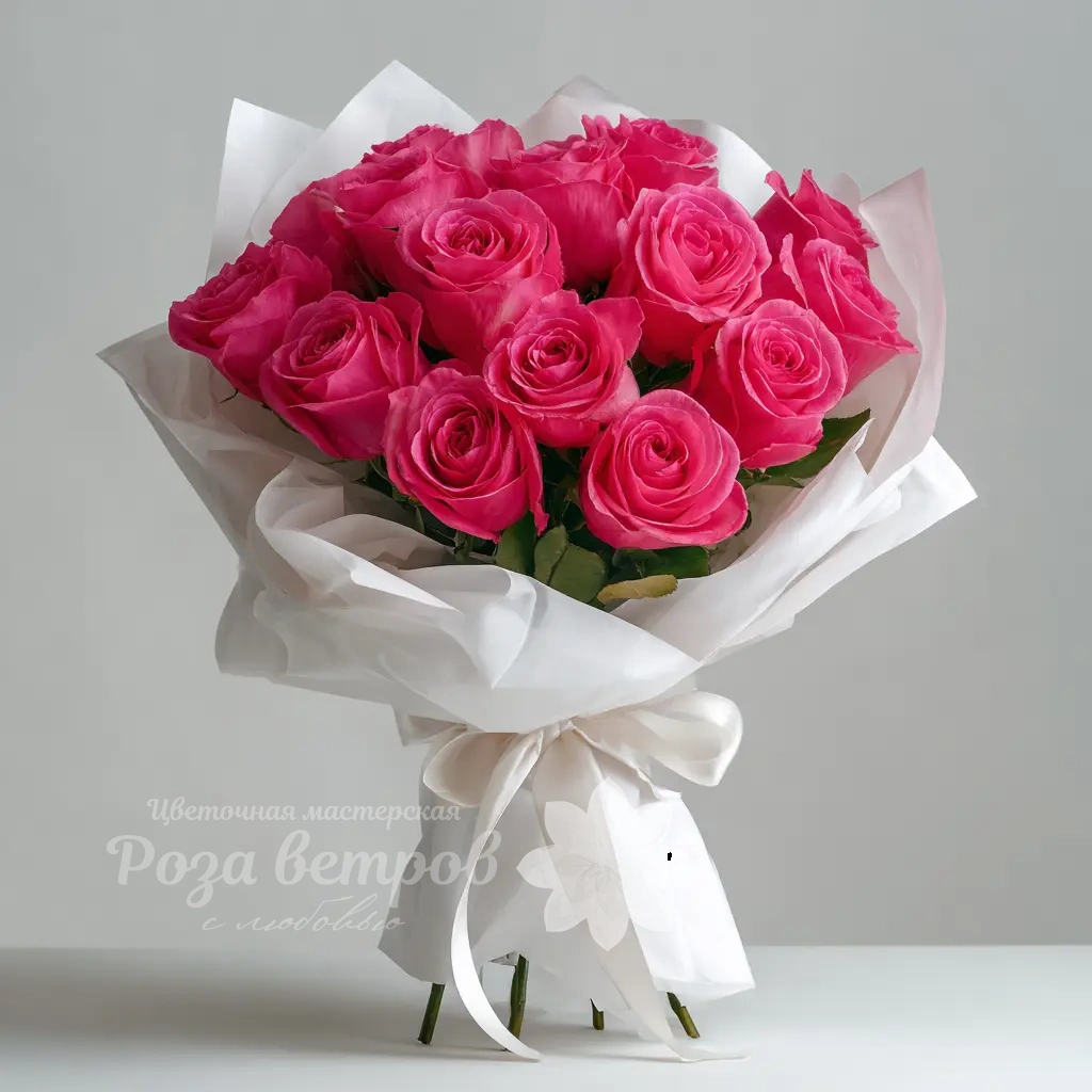 Нежный букет из 15 розовых роз средней длины — для тех, кто хочет выразить заботу, признательность или тёплые чувства. Универсальный цвет подойдёт как девушке, так и маме.