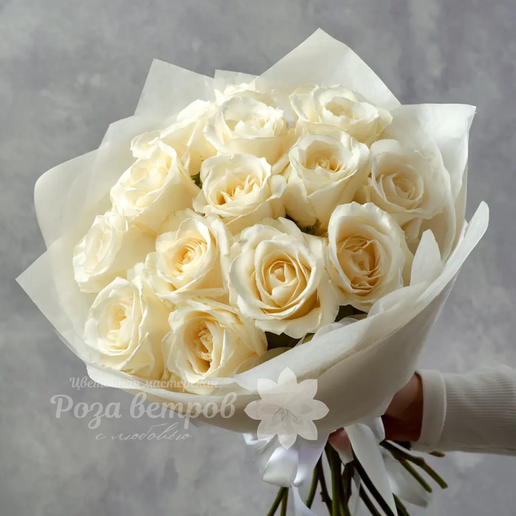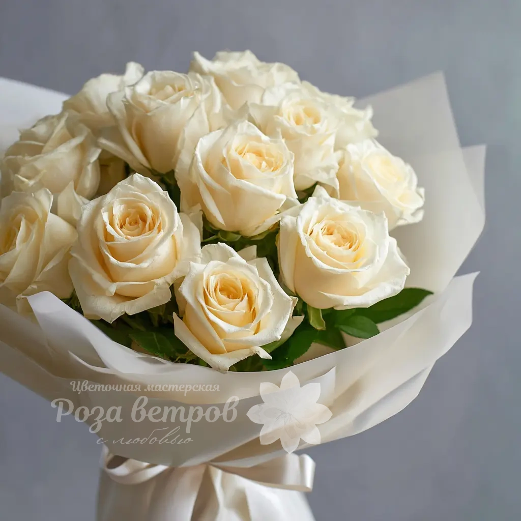 Невесомый и светлый букет из 15 белых роз высотой 40 см — символ чистоты и уважения. Идеален для официальных поздравлений, школьных мероприятий и трогательных моментов.